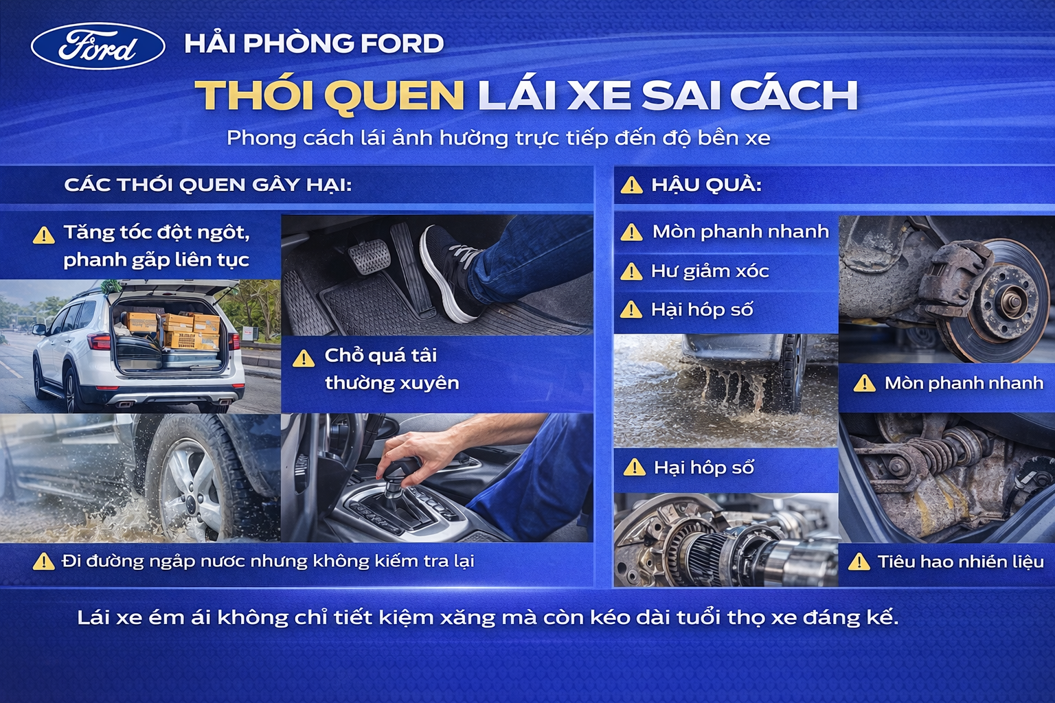 Sở hữu một chiếc ô tô Ford đồng nghĩa với việc bạn đang đầu tư cho sự an toàn, tiện nghi và giá trị sử dụng lâu dài. Tuy nhiên trên thực tế, rất nhiều xe dù mới sử dụng 2–3 năm đã bắt đầu xuống cấp, hao mòn nhanh, phát sinh hỏng hóc không đáng có.