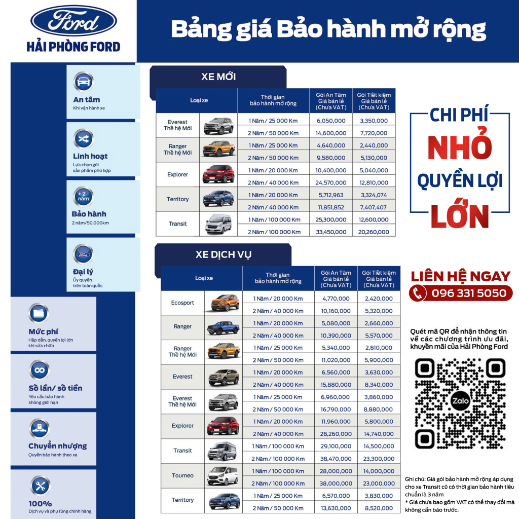 Cung cấp dịch vụ mở rộng bảo hành cho trên 29 chi tiết phụ tùng / nhóm phụ tùng quan trọng liên quan đến sự vận hành của xe bao gồm động cơ, hộp số, hệ thống cầu chủ động.