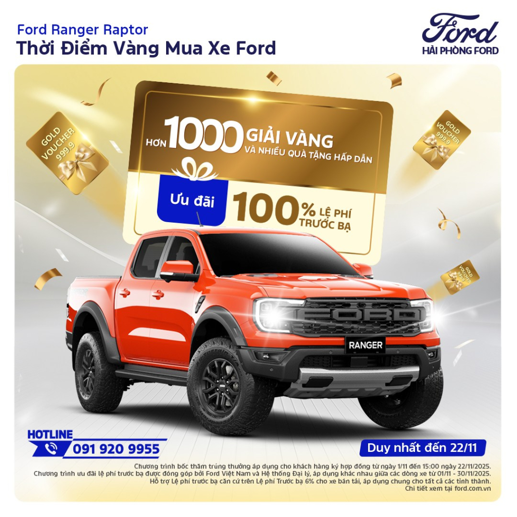 Tháng 11, Ranger Raptor trở lại Hải Phòng Ford với phong thái đầy cuốn hút: mạnh mẽ, đậm chất off-road, khả năng lội nước xuất sắc và ưu đãi hỗ trợ lệ phí trước bạ lên đến 100%. Nguồn xe đã sẵn sàng bàn giao ngay trong tháng, đáp ứng nhu cầu của khách hàng muốn nhận xe trước kỳ cao điểm cuối năm.