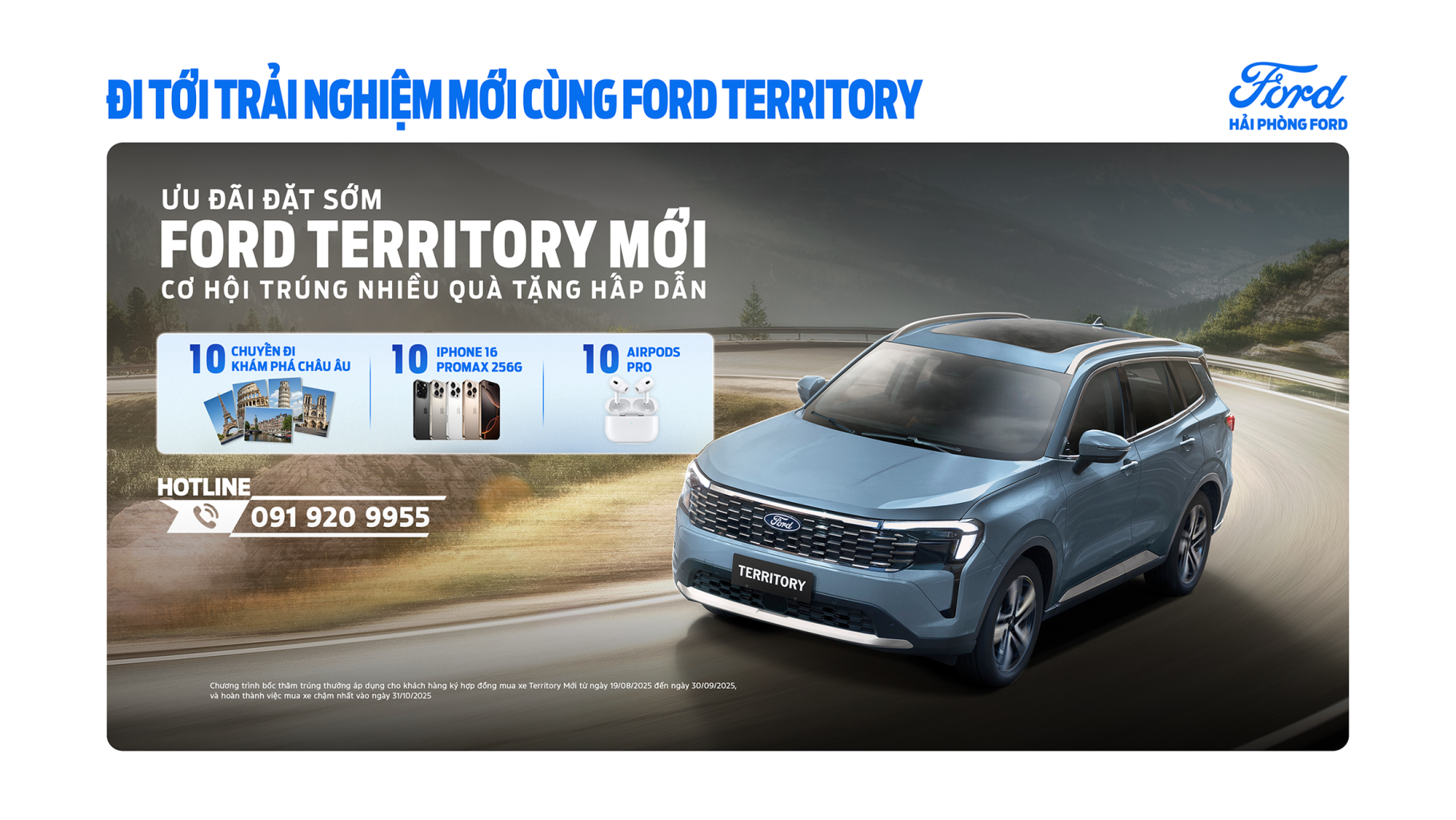 Từ ngày 19/08 đến 30/09/2025, Hải Phòng Ford cùng Ford Việt Nam chính thức triển khai chương trình Ưu Đãi Đặt Sớm Ford Territory Mới, mang đến cho khách hàng mẫu SUV hiện đại bậc nhất trong phân khúc, cùng cơ hội nhận về những phần quà giá trị đẳng cấp.